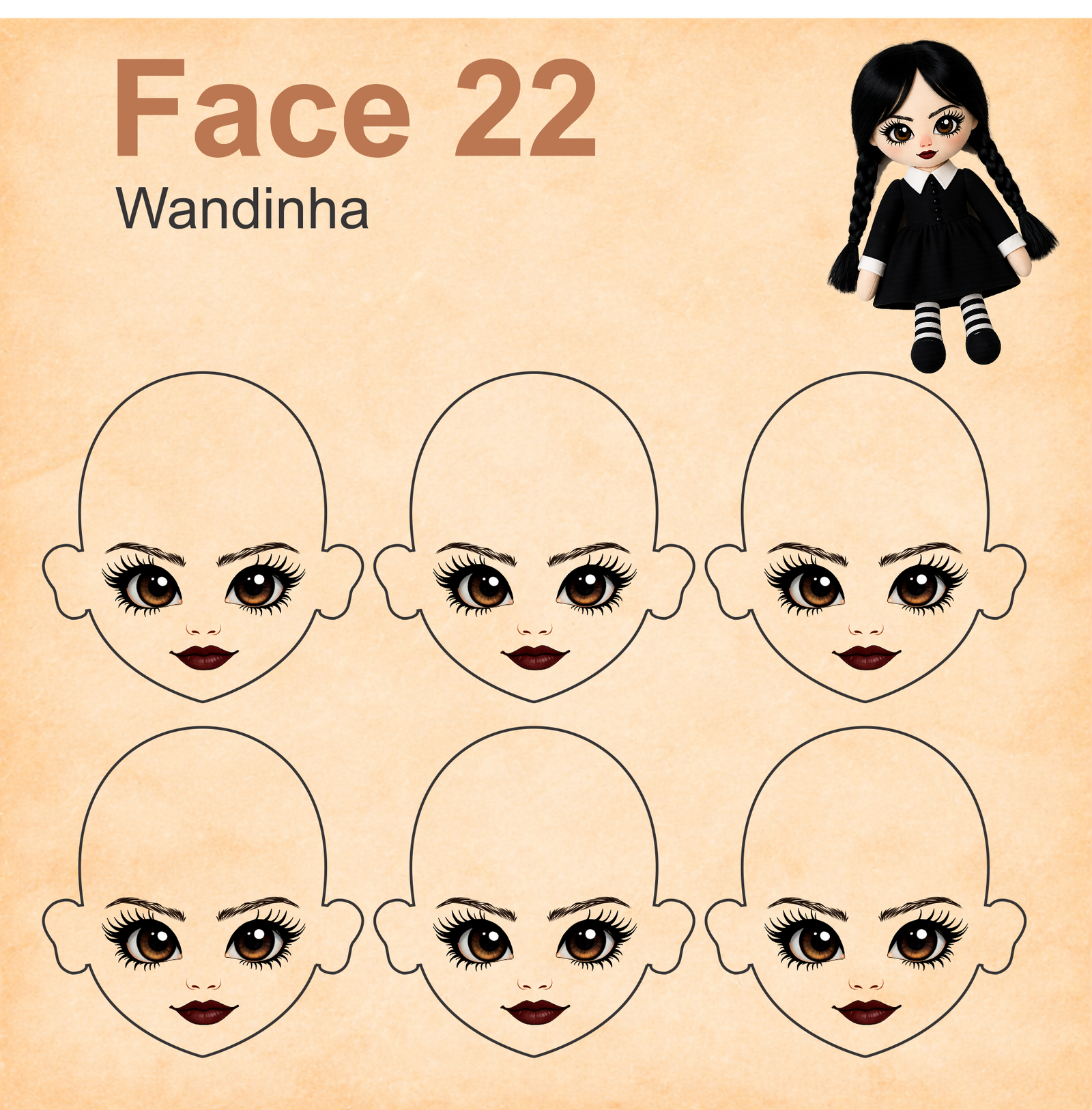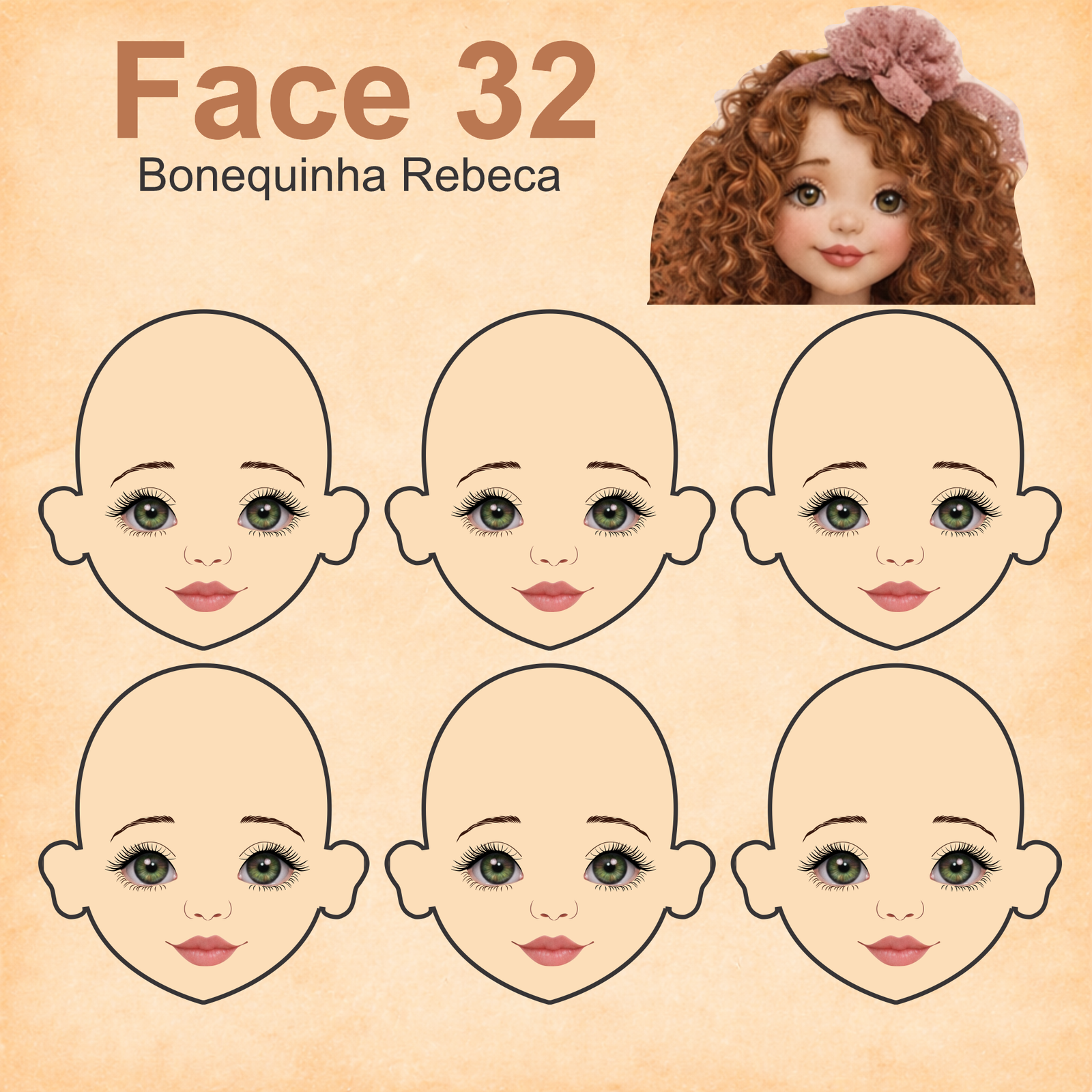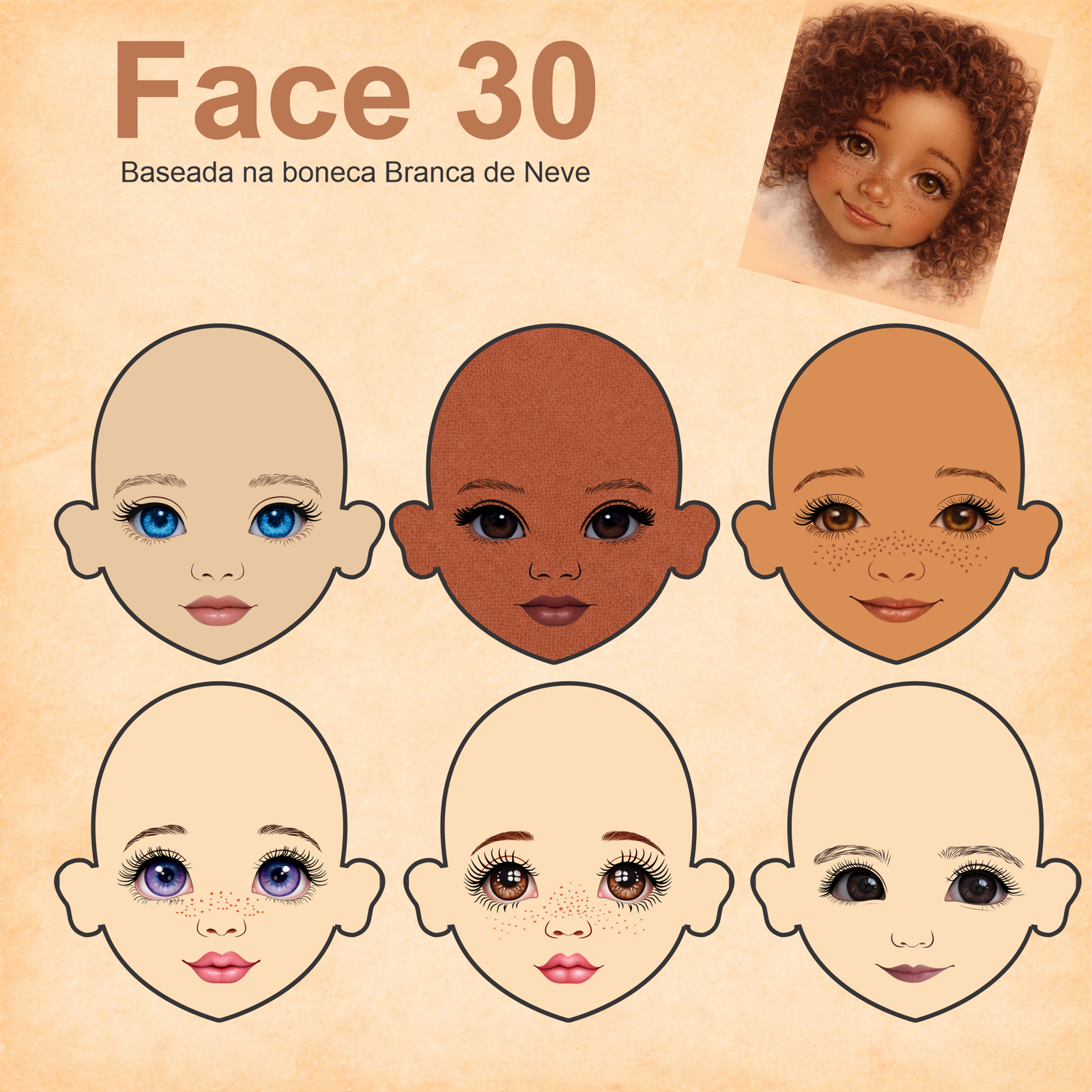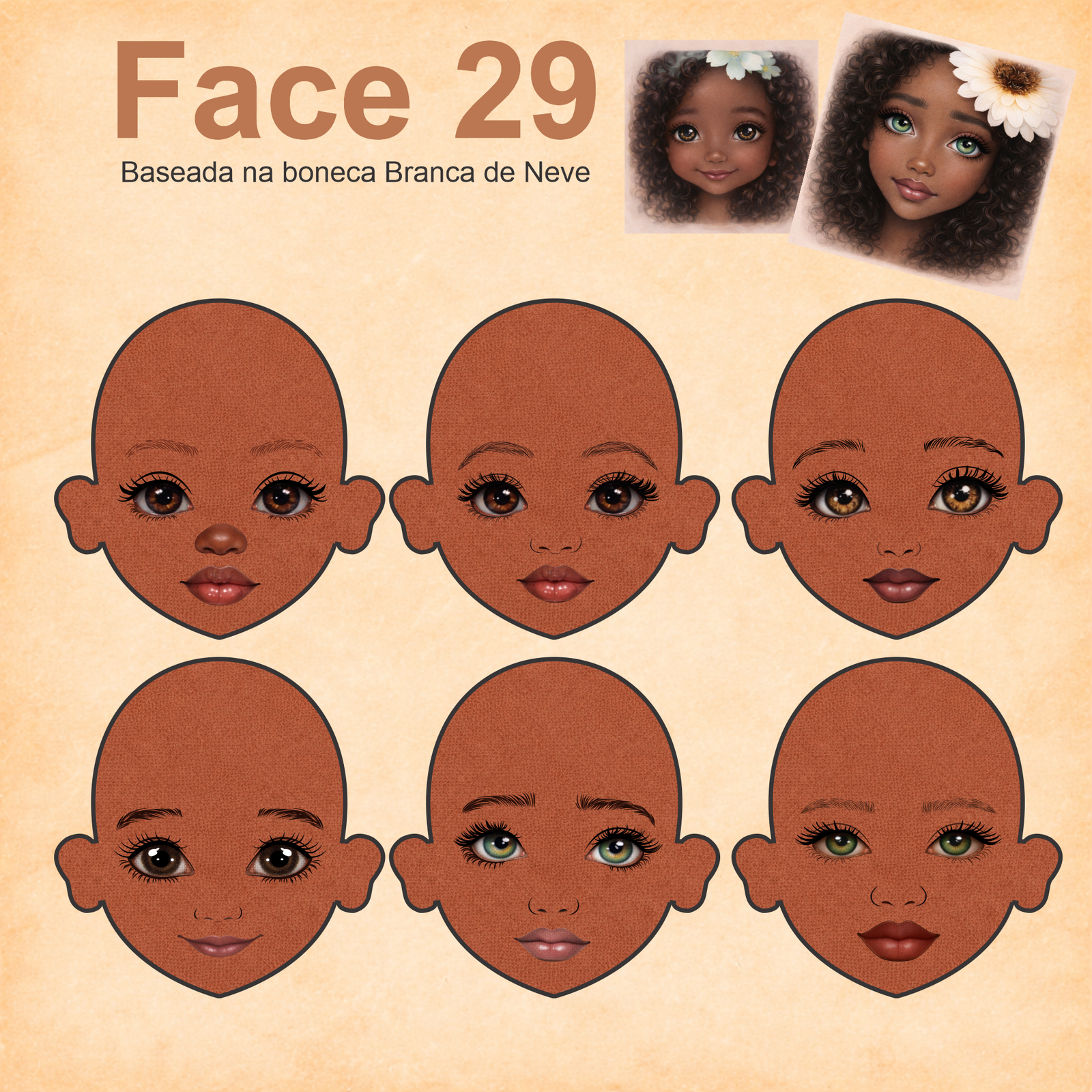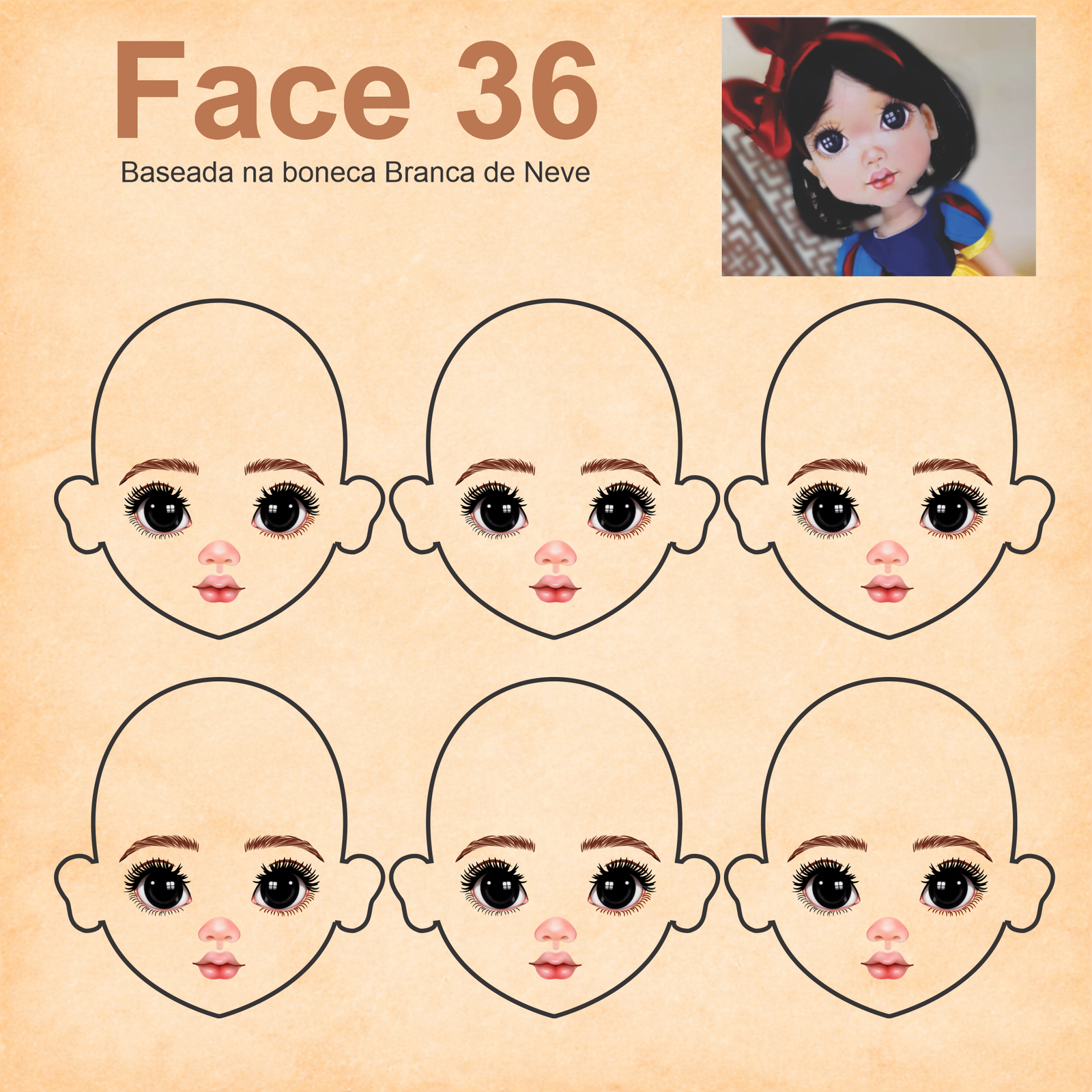 As imagens das bonequinhas são digitais e utilizadas como referência para facilitar o entendimento de como o rostinho pode ficar aplicado.
