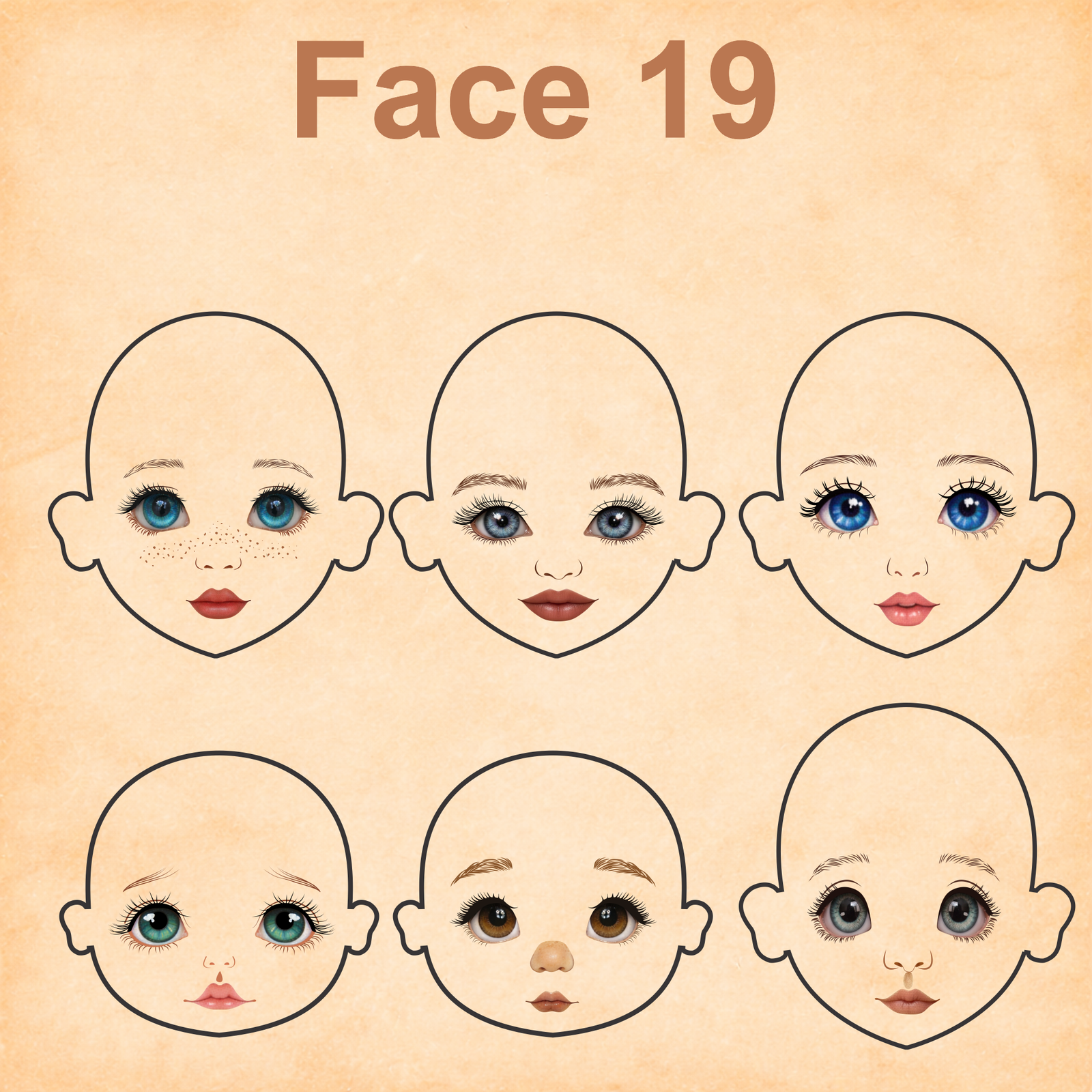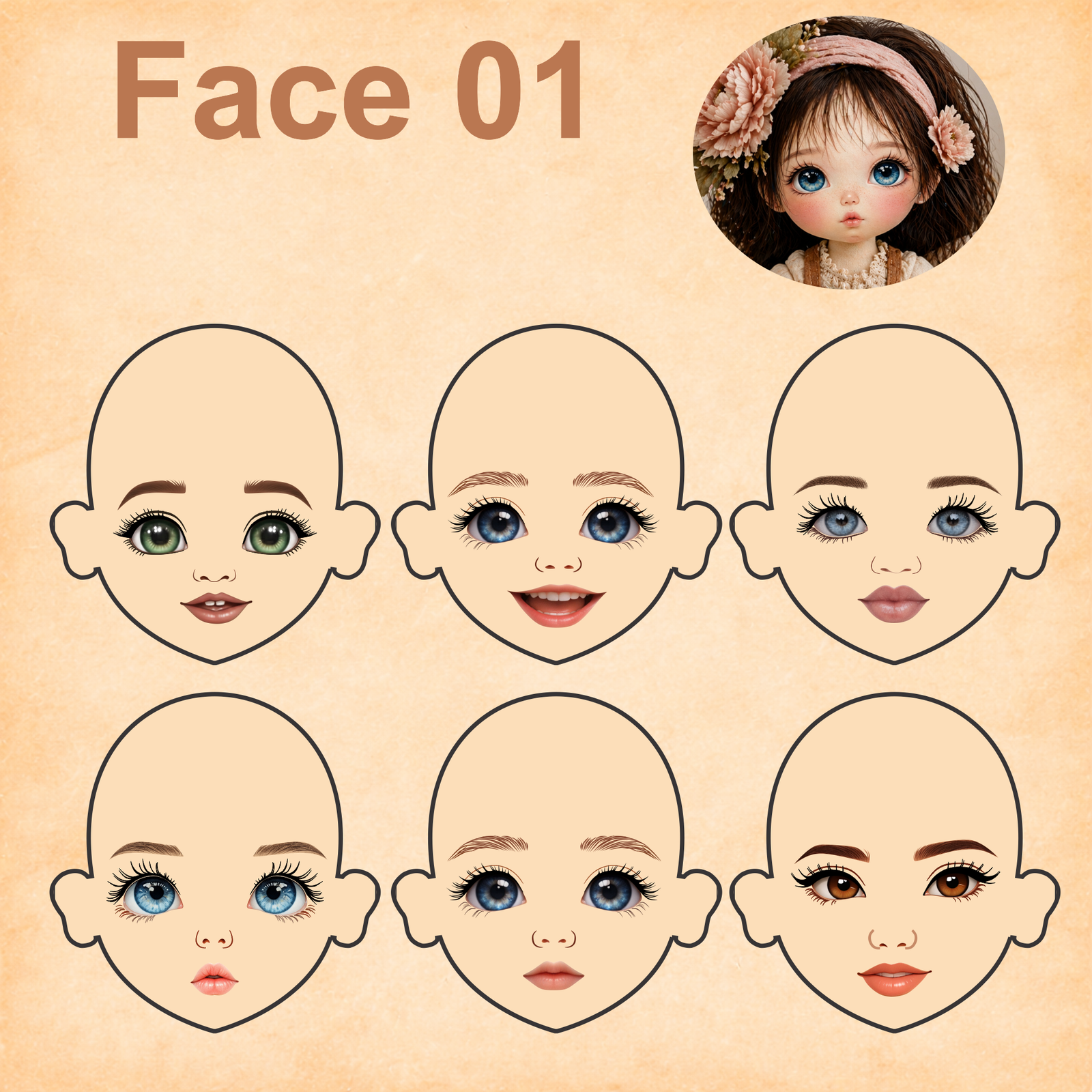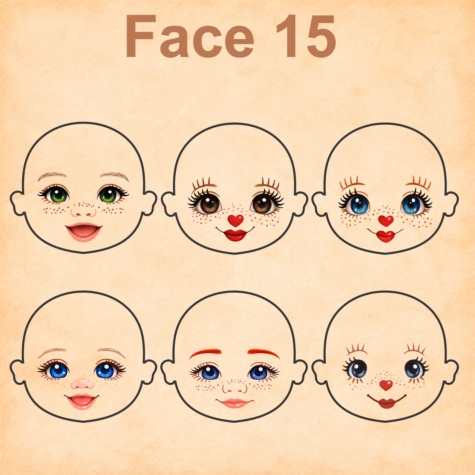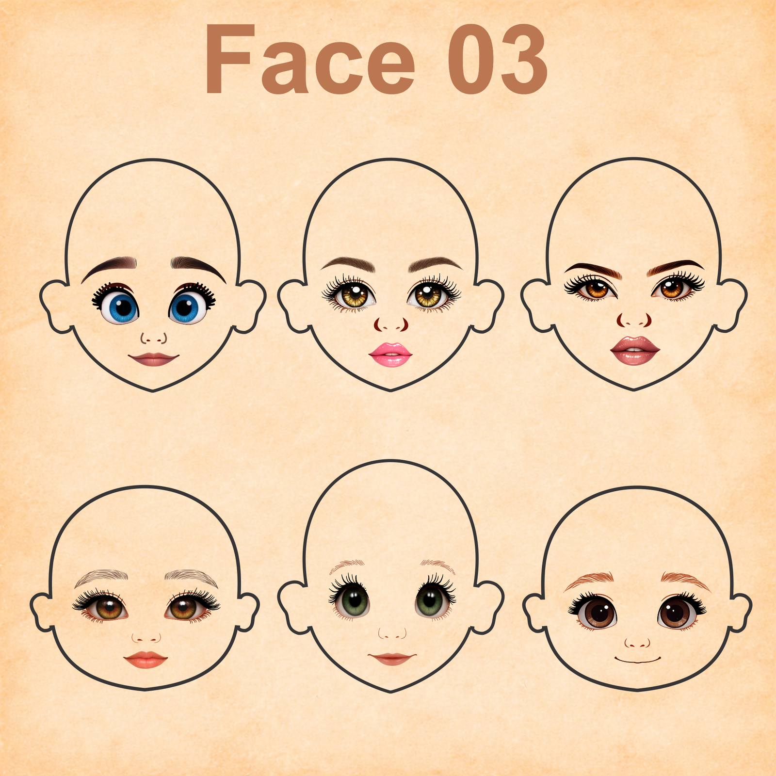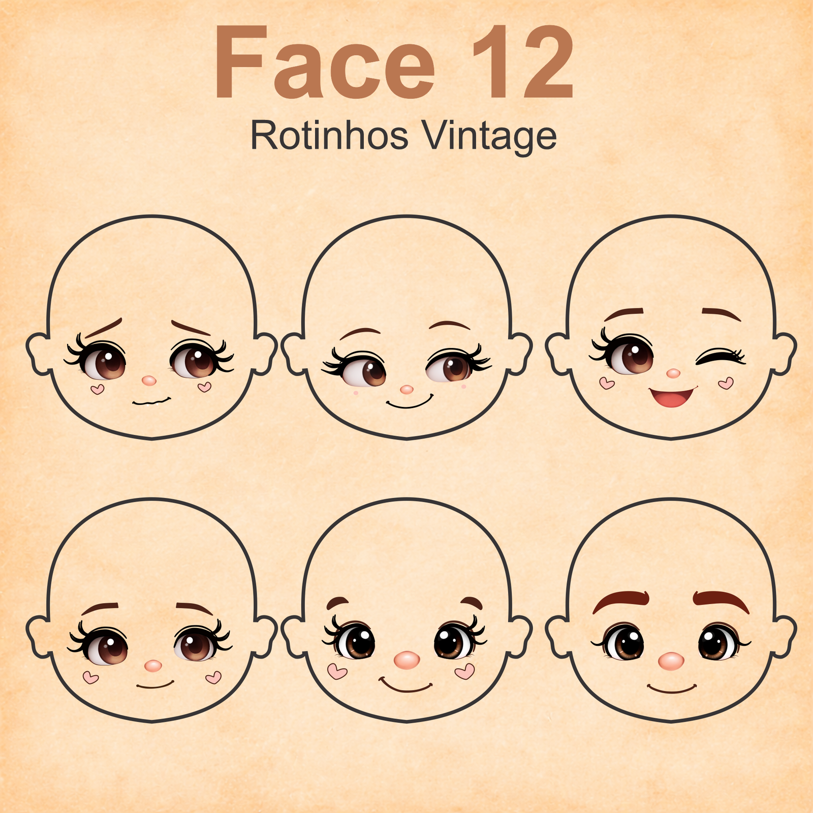 As imagens das bonequinhas são digitais e utilizadas como referência para facilitar o entendimento de como o rostinho pode ficar aplicado.