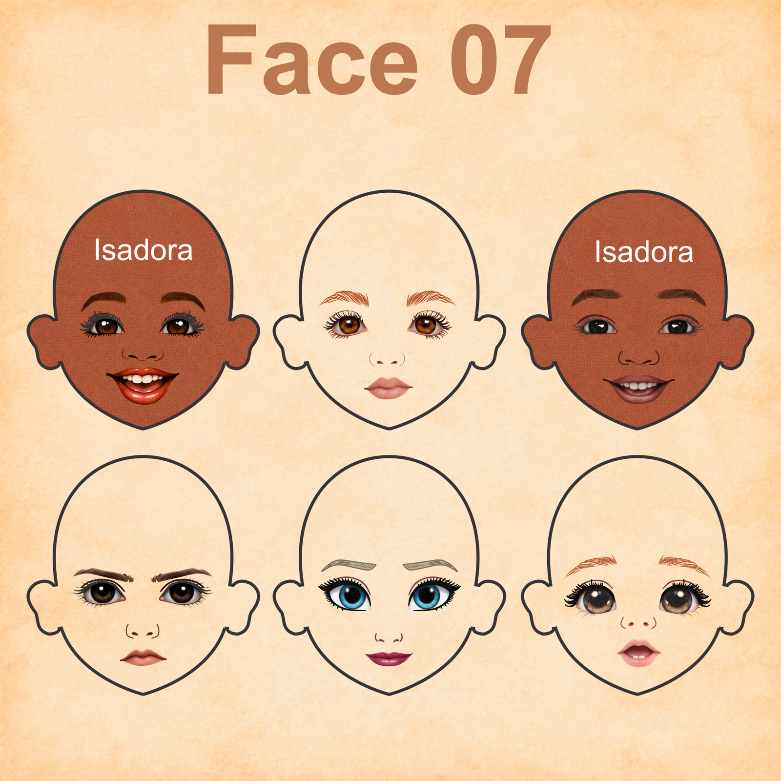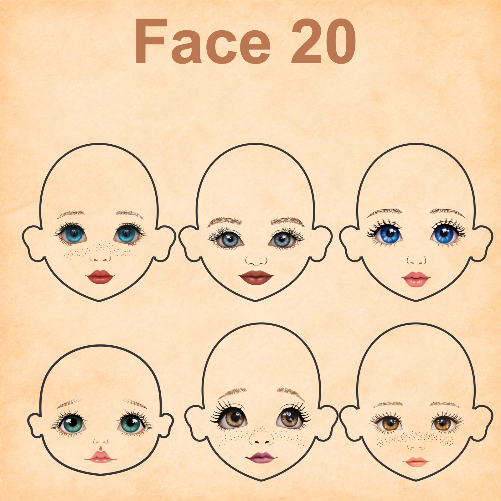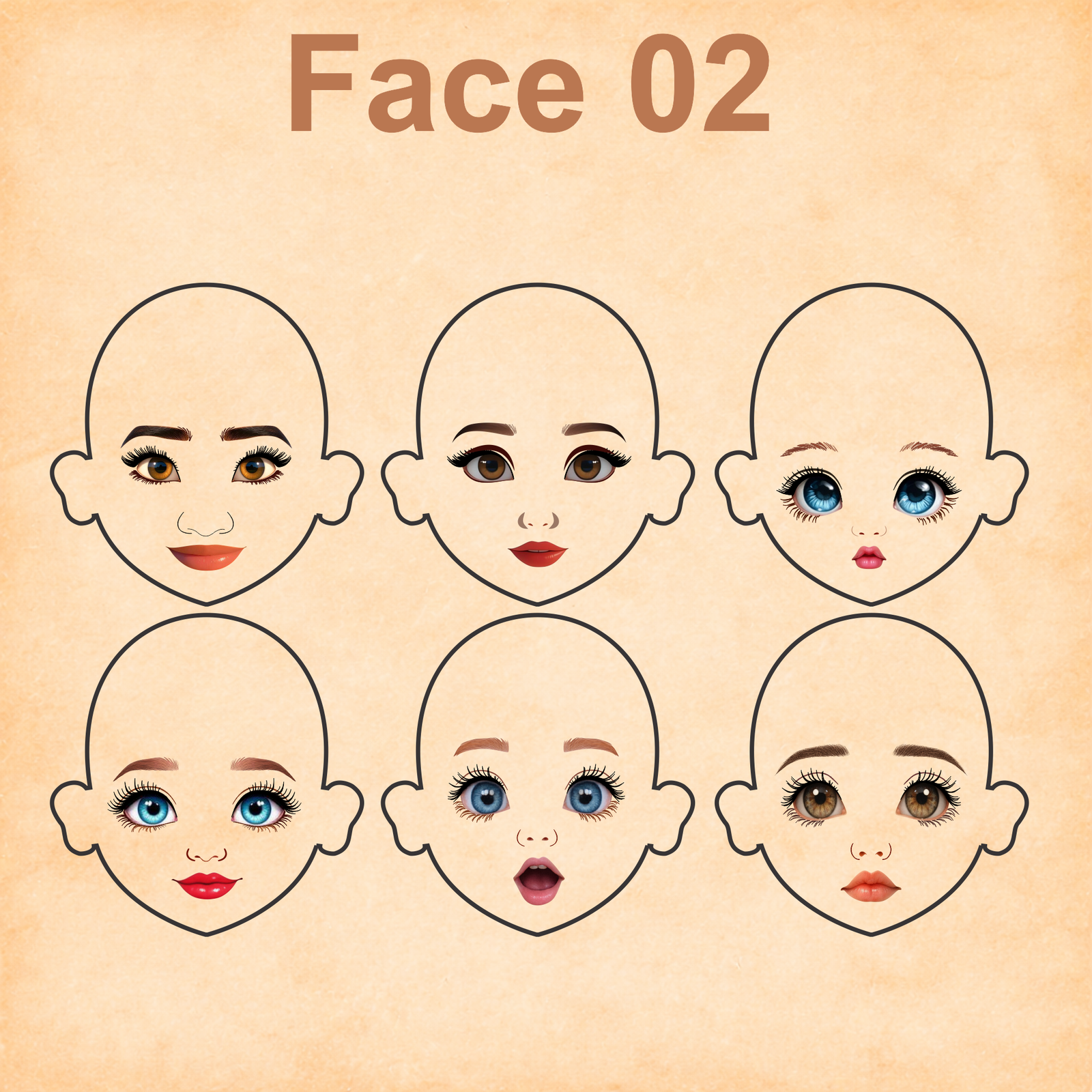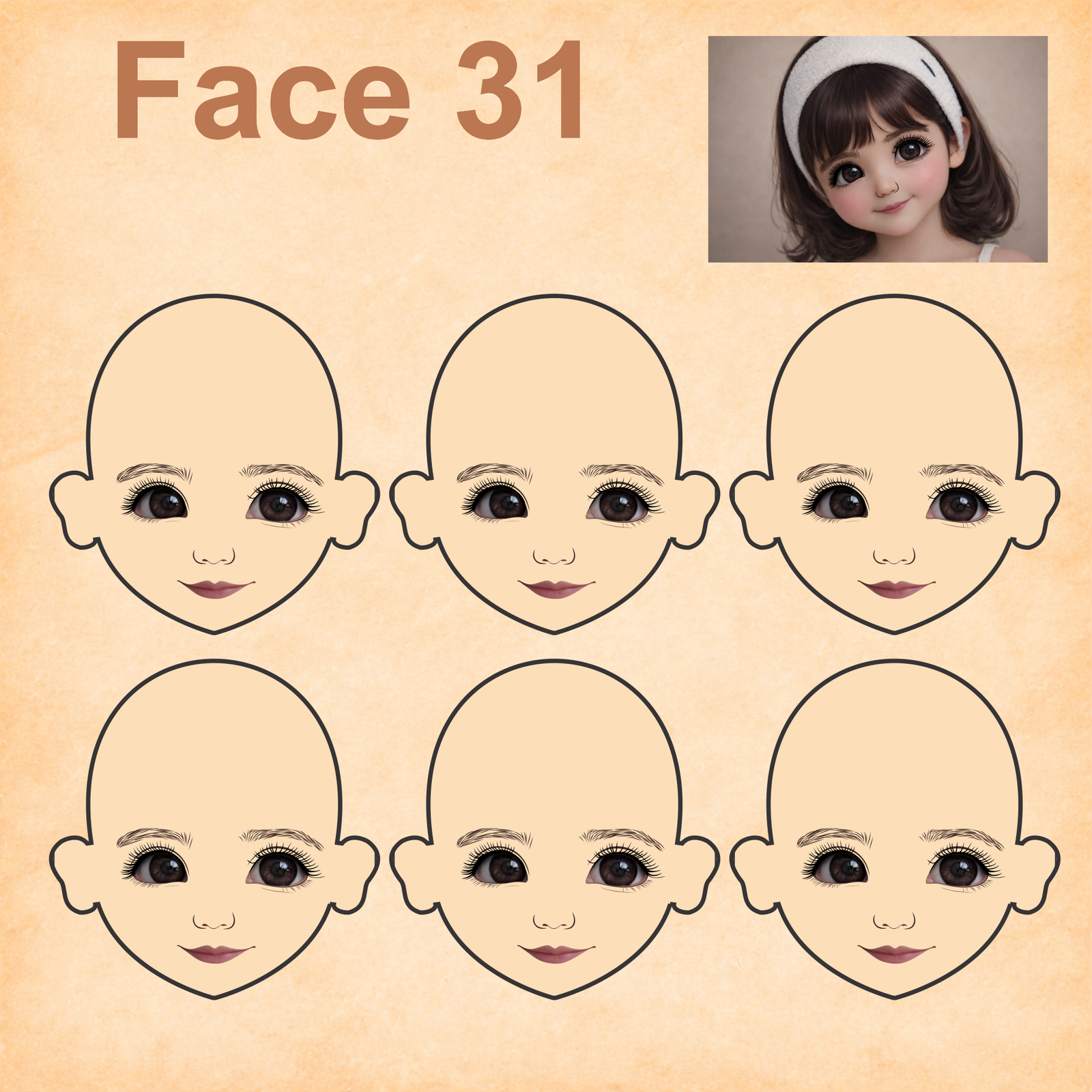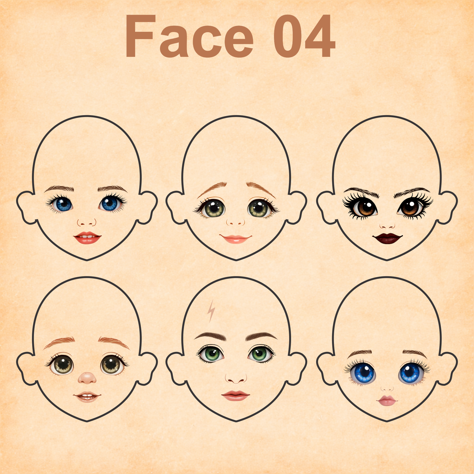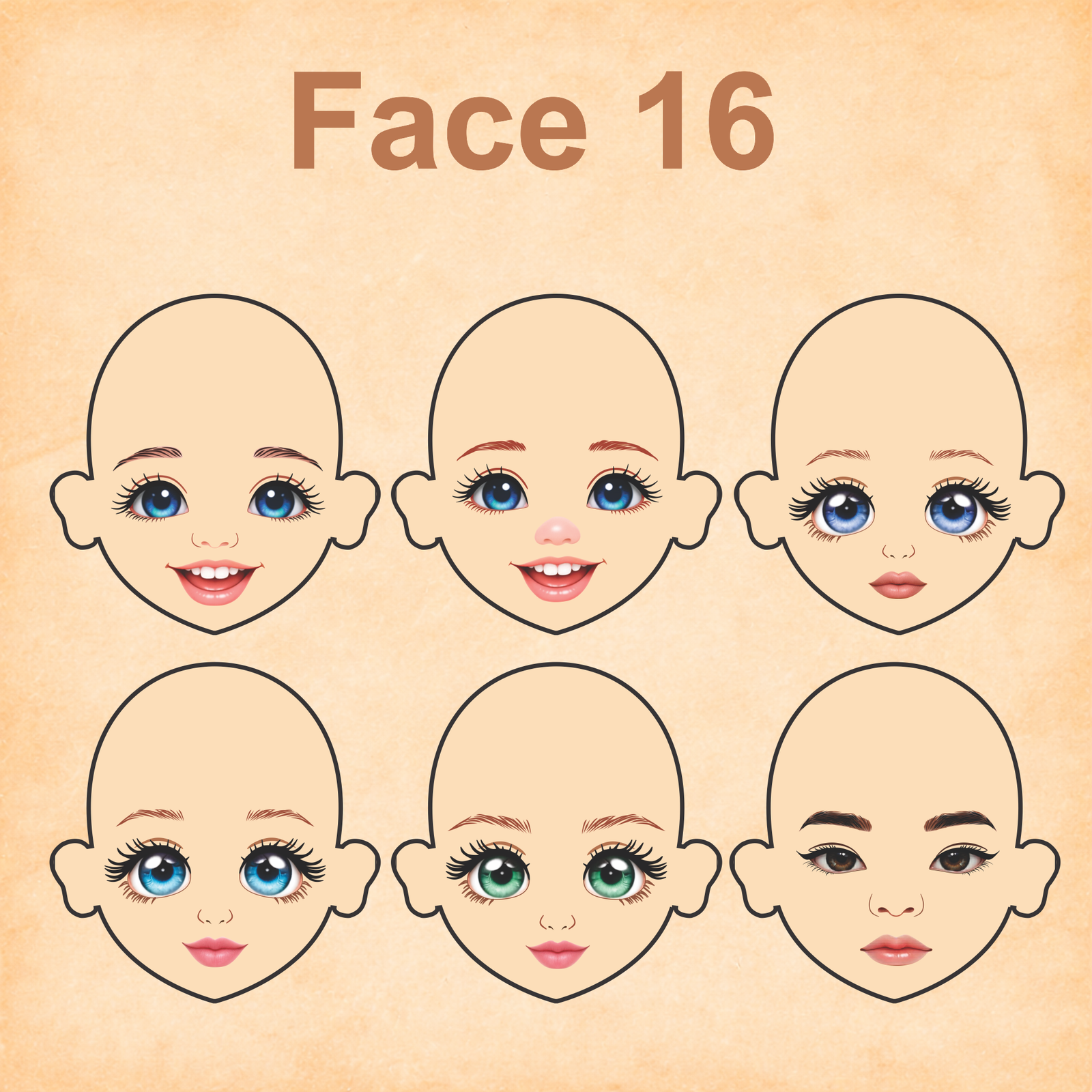 As imagens das bonequinhas são digitais e utilizadas como referência para facilitar o entendimento de como o rostinho pode ficar aplicado.