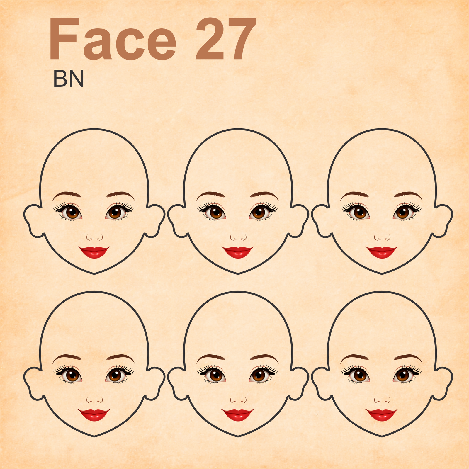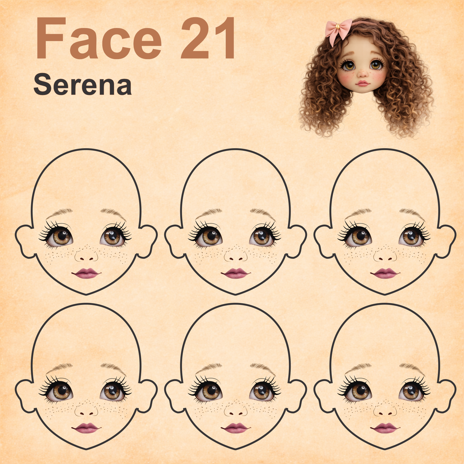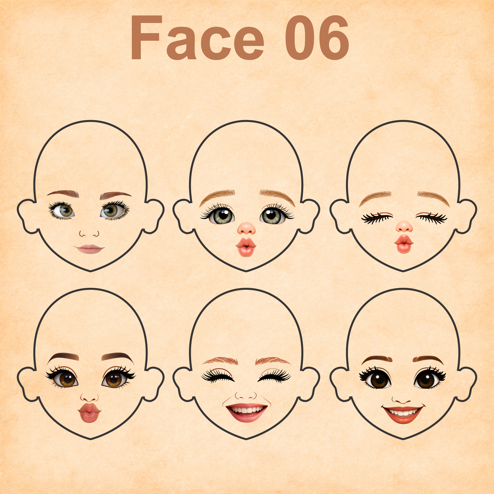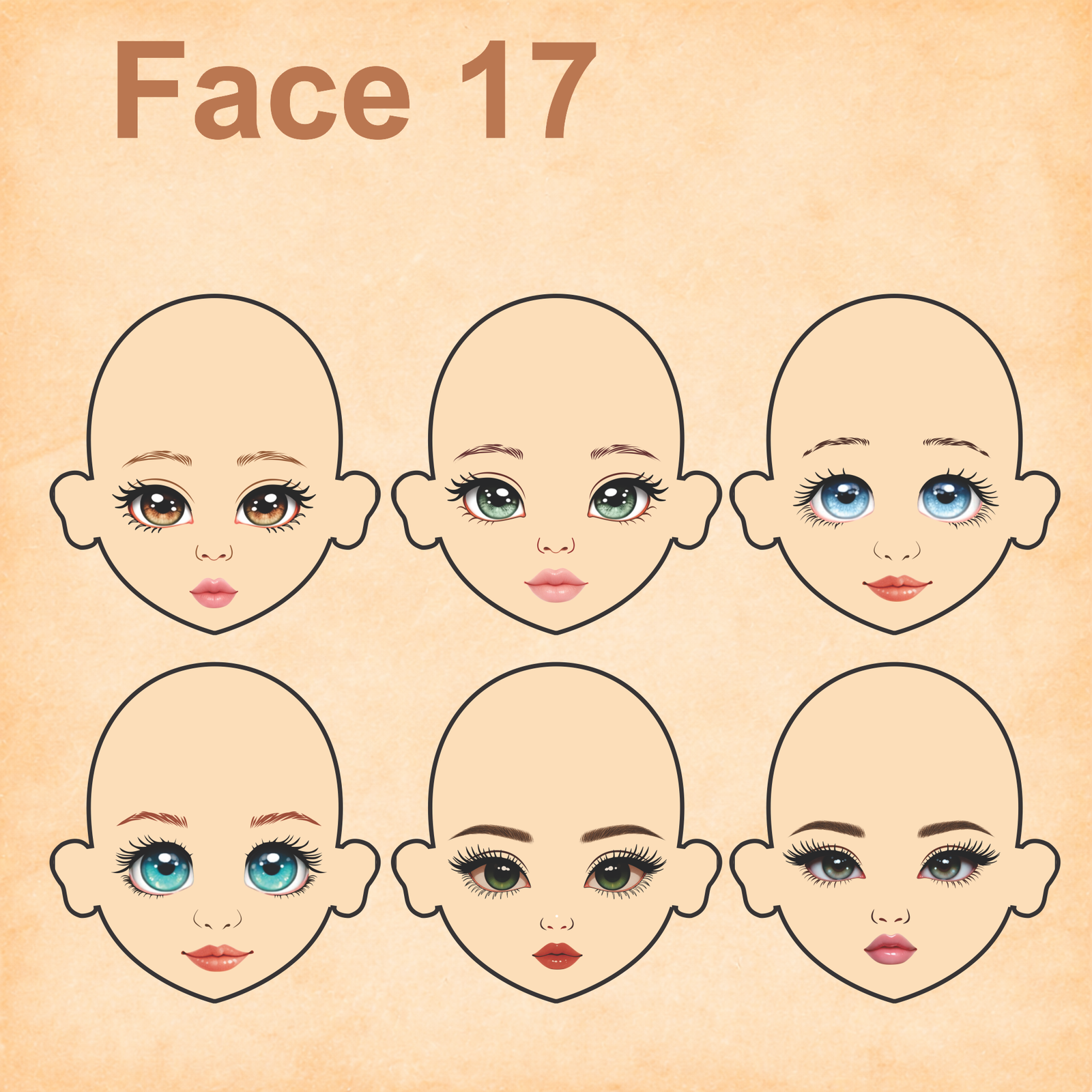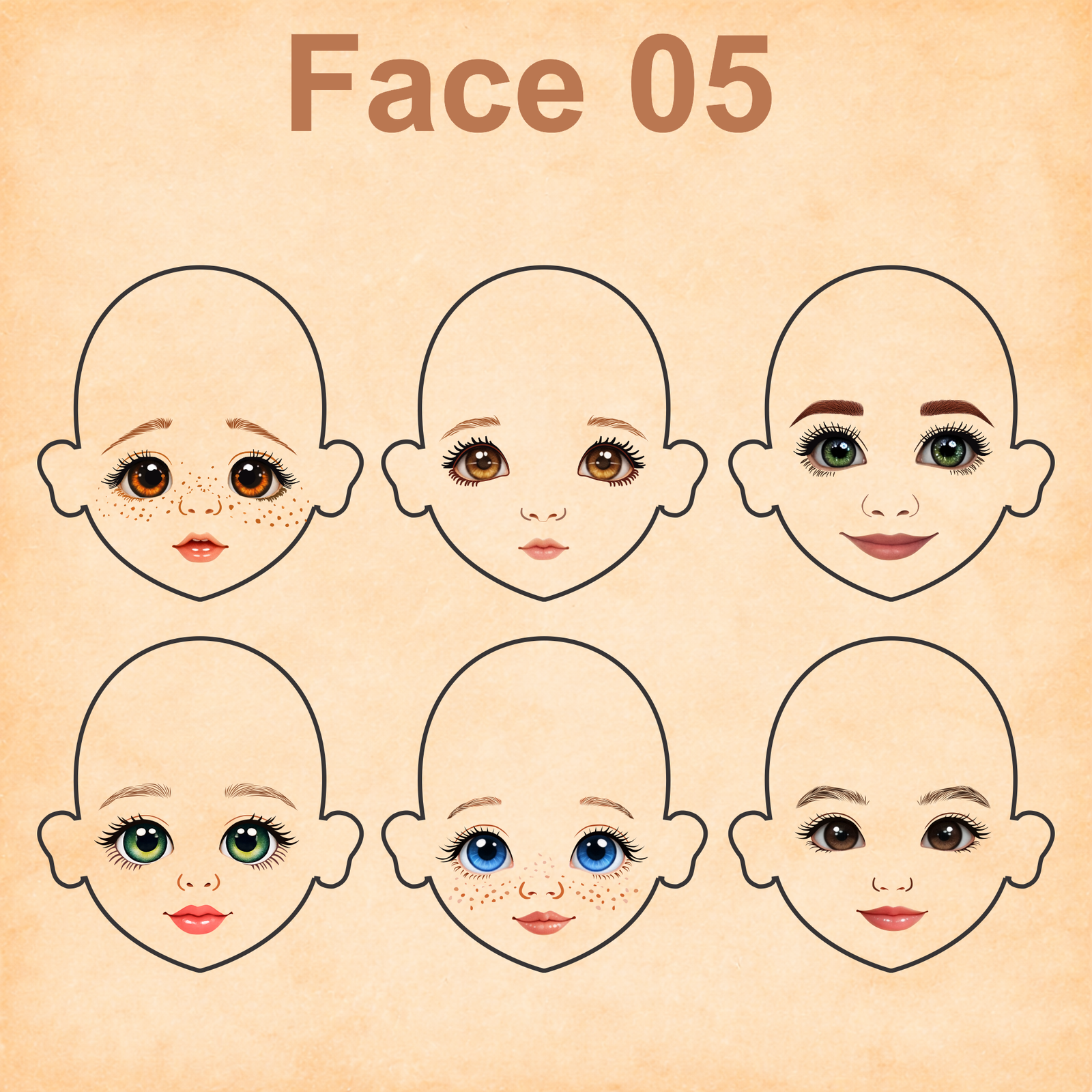 As imagens das bonequinhas são digitais e utilizadas como referência para facilitar o entendimento de como o rostinho pode ficar aplicado.