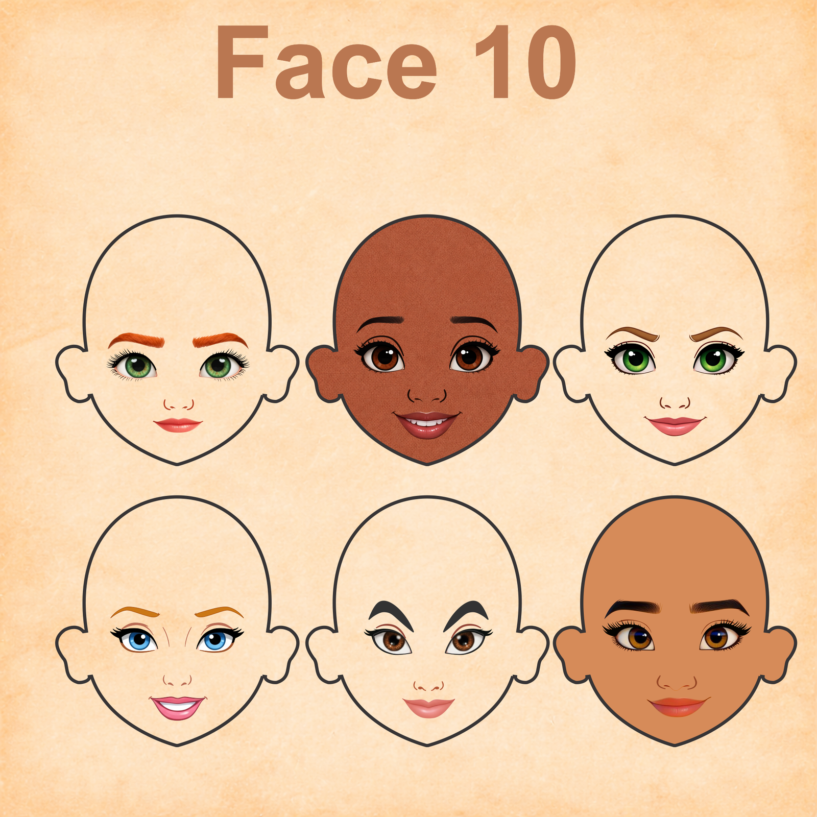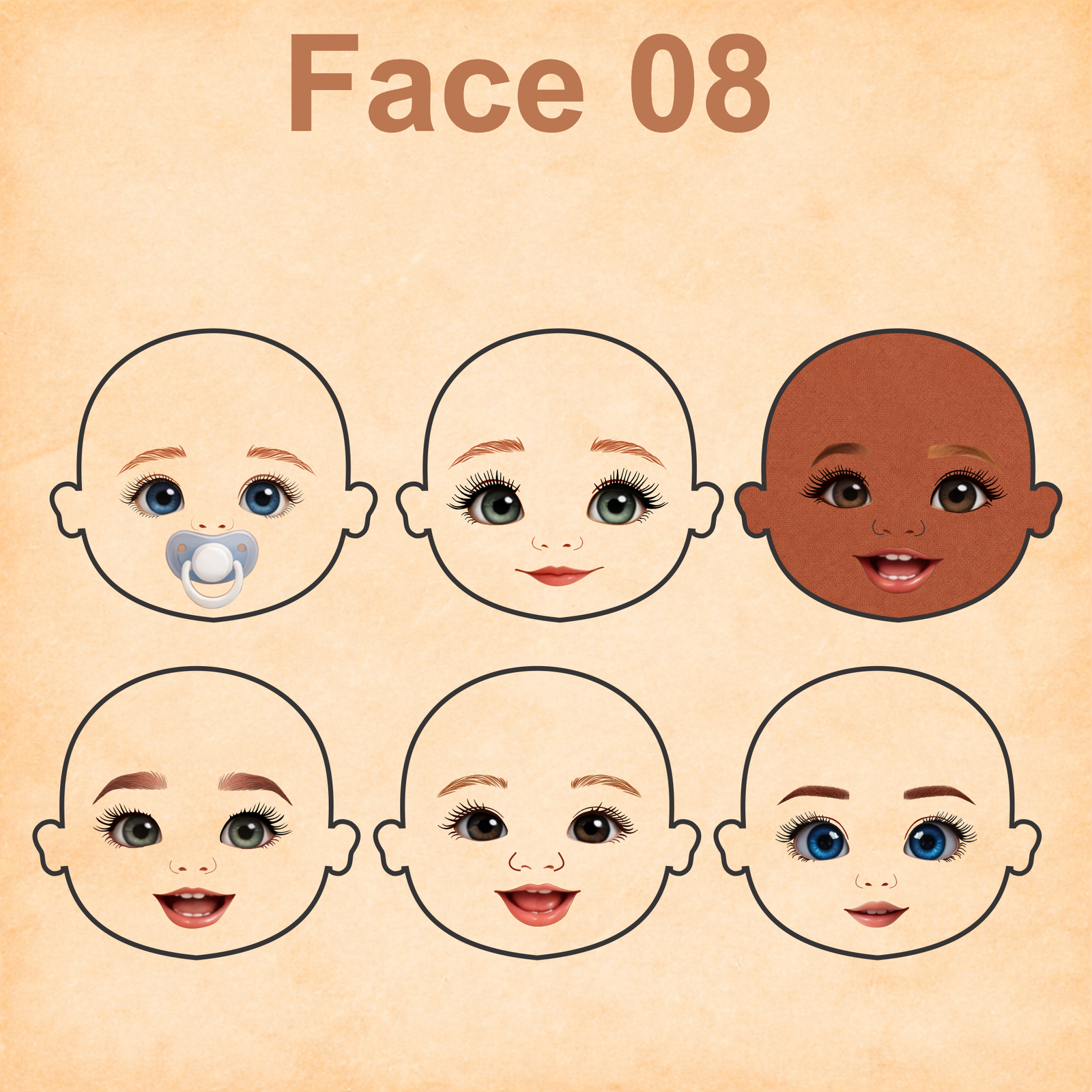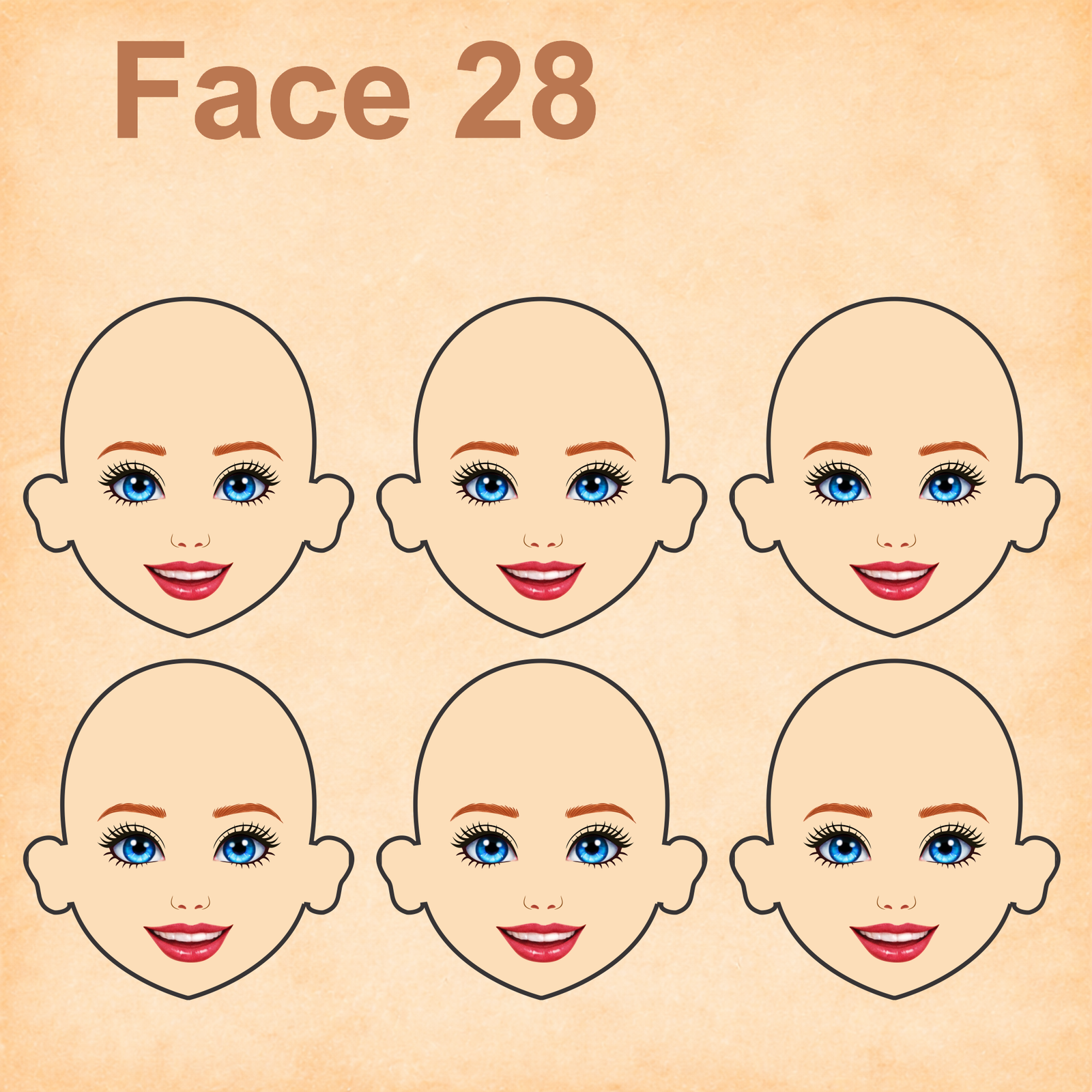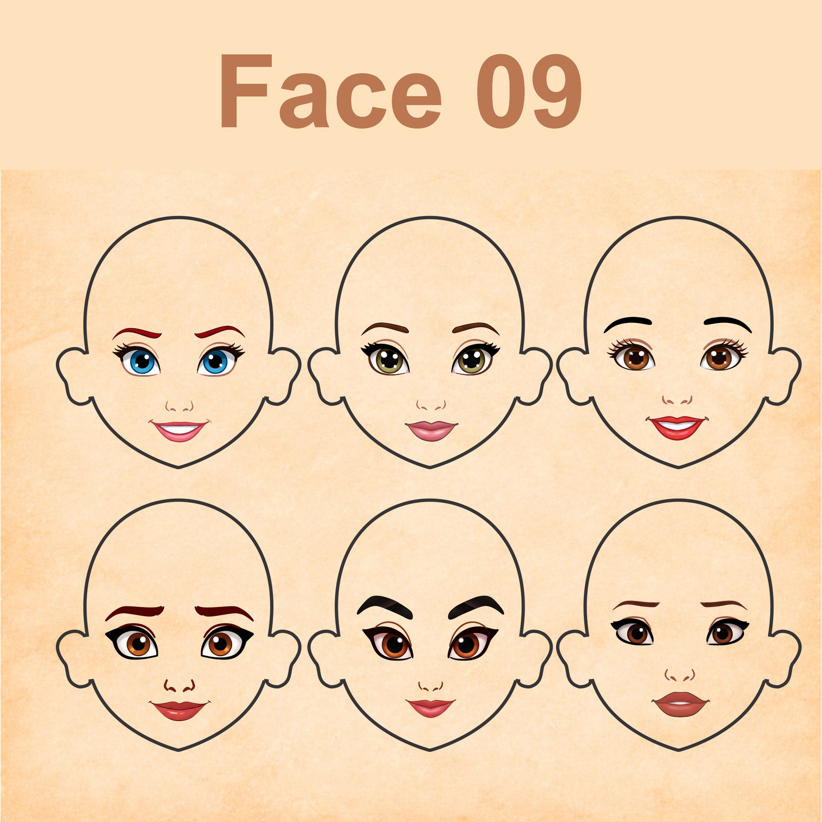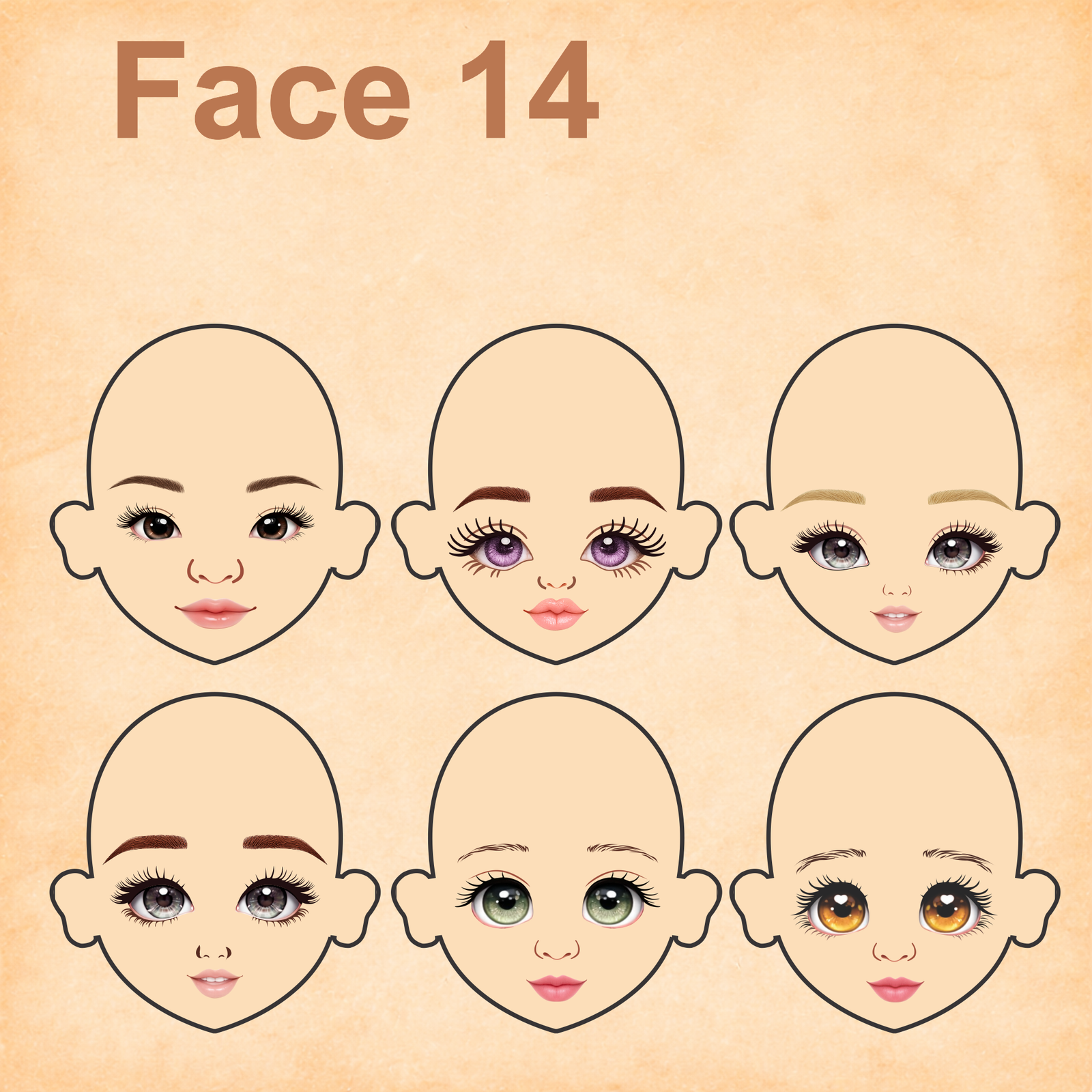 As imagens das bonequinhas são digitais e utilizadas como referência para facilitar o entendimento de como o rostinho pode ficar aplicado.